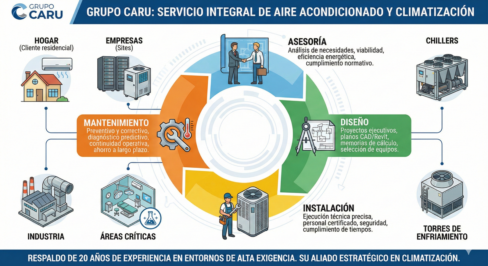 En Grupo Caru, entendemos que la ingeniería de aire acondicionado y climatización integral no es solo una cuestión de confort, sino un componente crítico para la continuidad de procesos industriales, la seguridad en centros de datos y la salud en entornos hospitalarios. Con más de 20 años de especialización, nos hemos consolidado como líderes en sistemas HVAC (Heating, Ventilation, and Air Conditioning) de alta complejidad.