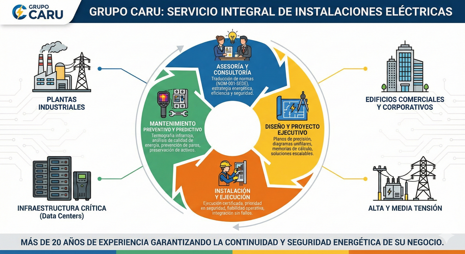 En Grupo Caru, entendemos que la energía eléctrica es el motor que mantiene viva la operación de nuestros clientes. Con más de 20 años de trayectoria en servicios de instalación eléctrica industrial y comercial, no solo realizamos instalaciones; diseñamos sistemas robustos que garantizan la continuidad operativa, cumplen con las normativas más estrictas de la CFE y aseguran la protección de su maquinaria y personal.